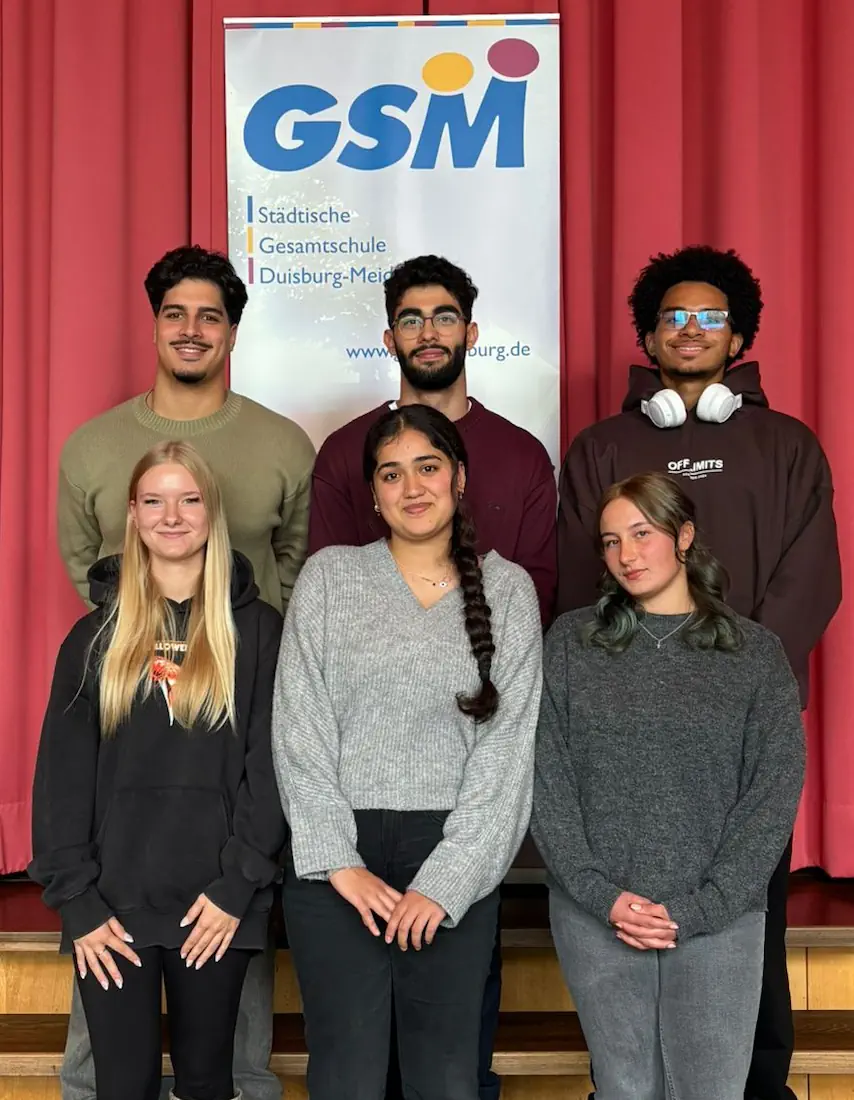 3 Schülerinnen und 3 Schüler stehen vor einem Plakat mit dem Logo der Gesamtschule Meiderich. Sie bilden die Schülervertretung.